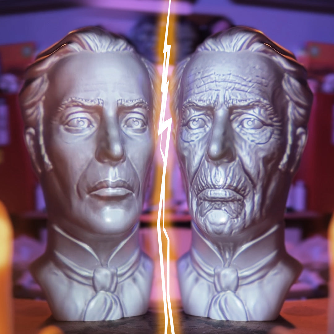 Withering Wendell is a front projected haunted statue illusion that appears to age before your eyes from a young man to a withered old corpse.